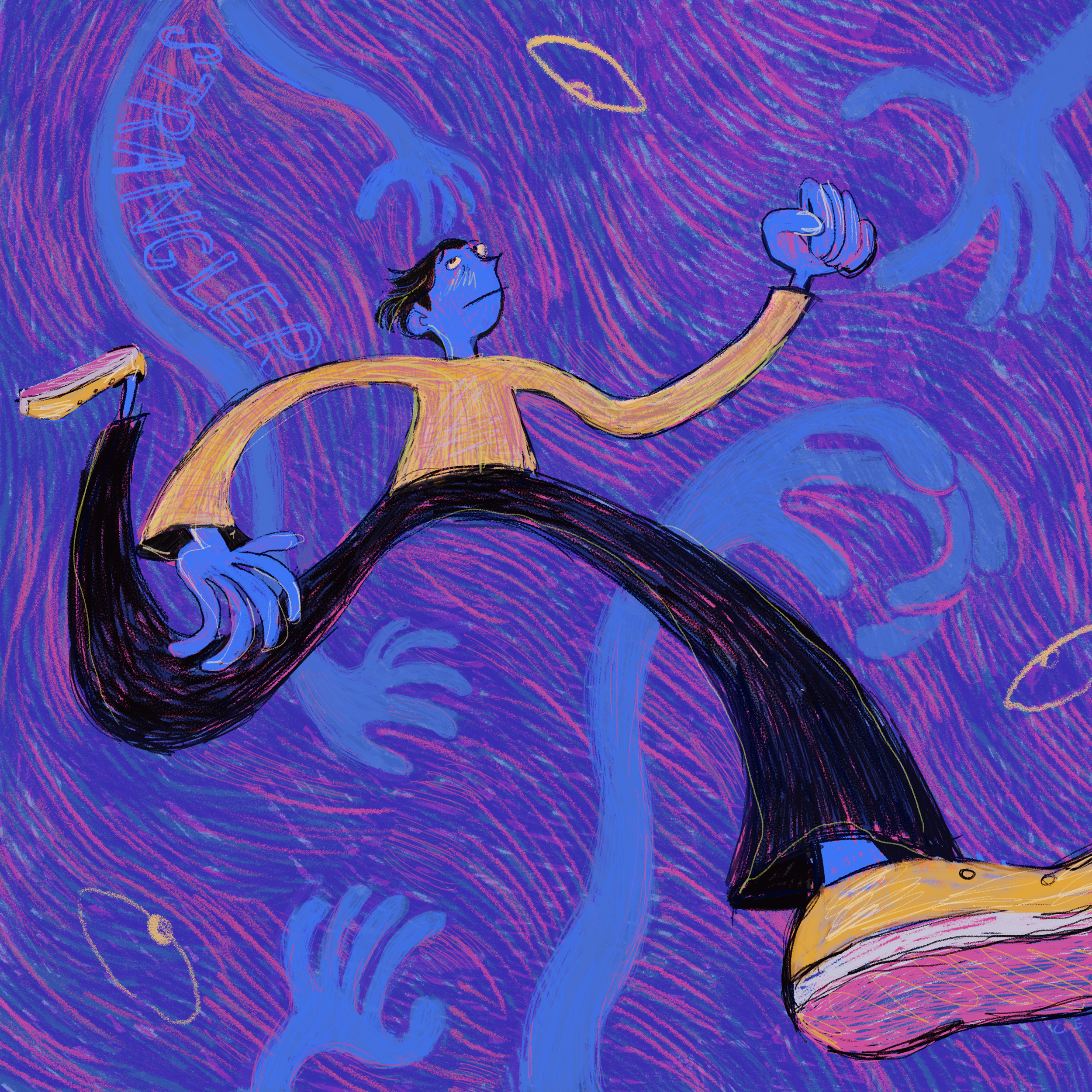 For this was used the concept of running aways and being trapped with eyes and hands trying to grab the main character, but with a constrasting and very colorful palette.